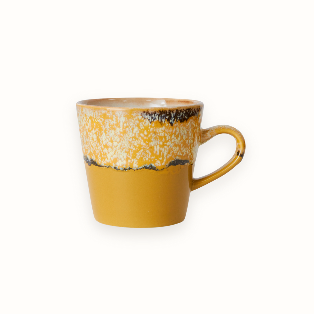Retro yet modern: the coolest coffee mugs. De Americano Mugs van HKLIVING hebben een subtiele meer rechte vorm met oor. De kleur Sunbeam is een prachtige oker tint met opvallende rand. De 70s ceramics van HKLIVING worden handbeschilderd en geglazuurd, elk item is dus uniek.