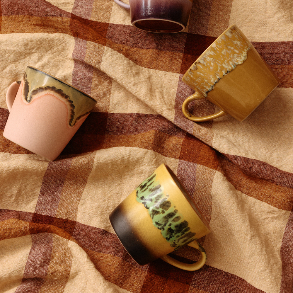 Retro yet modern: the coolest coffee mugs. De Americano Mugs van HKLIVING hebben een subtiele meer rechte vorm met oor. De kleur Kelp is een prachtige combinatie van zonnige gele tinten met fris groen en diep donkerbruin. De 70s ceramics van HKLIVING worden handbeschilderd en geglazuurd, elk item is dus uniek.