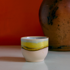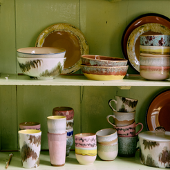 The dreamiest coffee cup you'll ever find. De Café Cups van HKLIVING hebben een fijne, meer ronde vorm. De kleur Glint is beige met een felgekleurde rand in lime en turquoise. De 70s ceramics van HKLIVING worden handbeschilderd en geglazuurd, elk item is dus uniek.