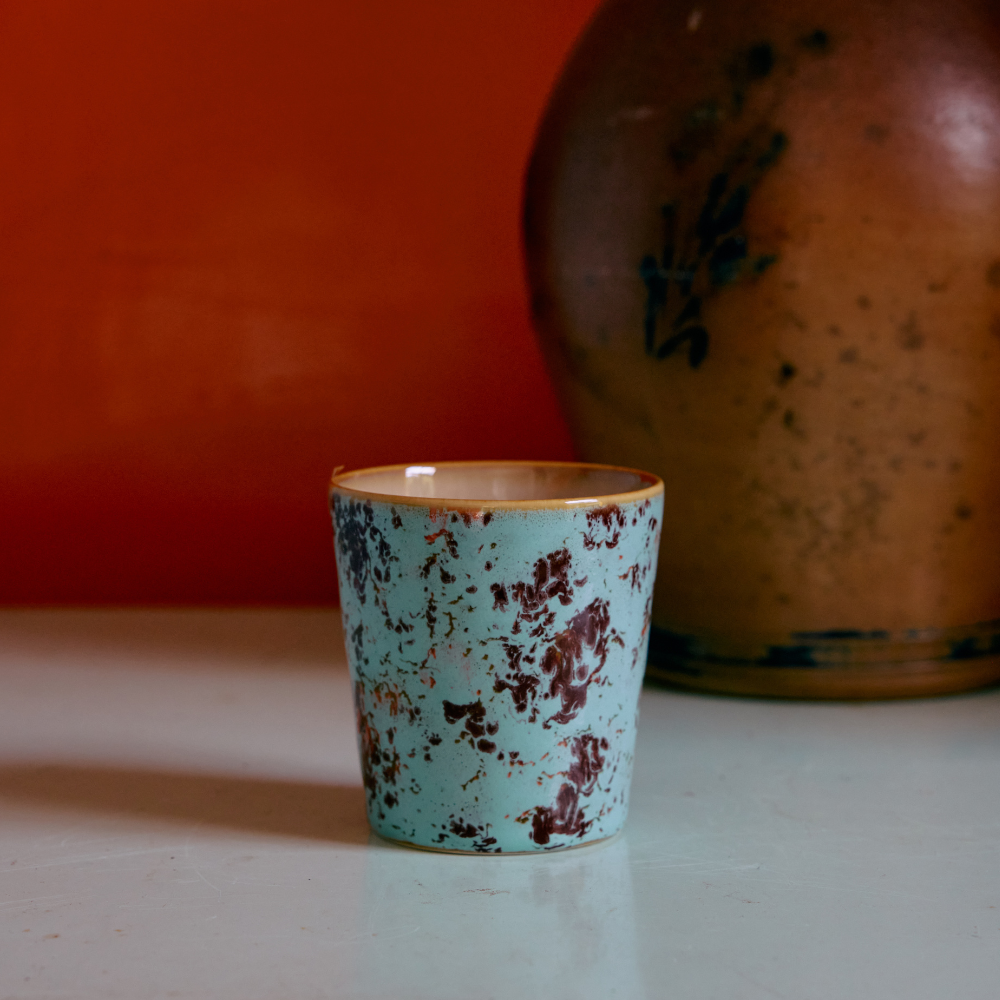 Retro yet modern: the coolest coffee mugs. De Coffee Mugs van HKLIVING hebben een subtiele meer rechte vorm. De kleur Patina is een prachtige combinatie van diep chocoladebruin en fel turquoise. De 70s ceramics van HKLIVING worden handbeschilderd en geglazuurd, elk item is dus uniek.