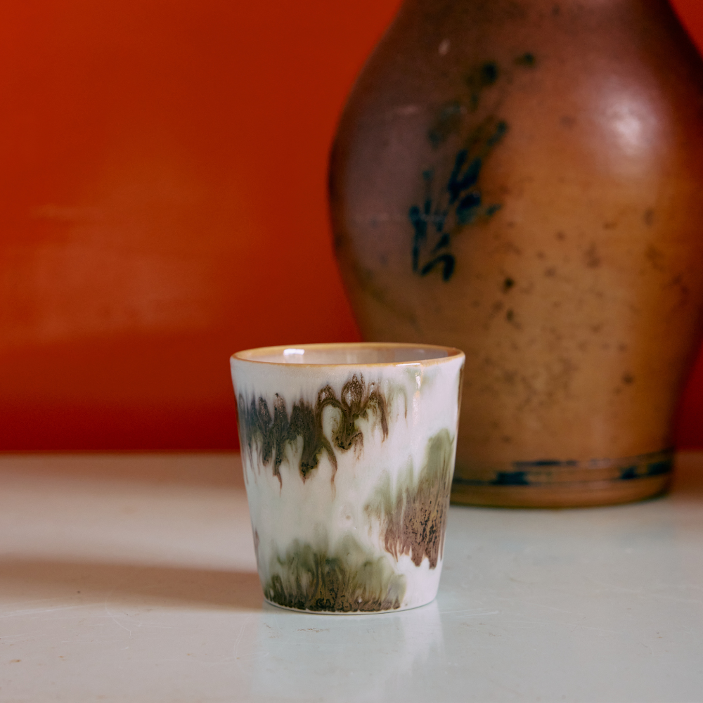 Retro yet modern: the coolest coffee mugs. De Coffee Mugs van HKLIVING hebben een subtiele meer rechte vorm. De kleur Tide is een prachtige combinatie van groene tinten in een stoer patroon. De 70s ceramics van HKLIVING worden handbeschilderd en geglazuurd, elk item is dus uniek.