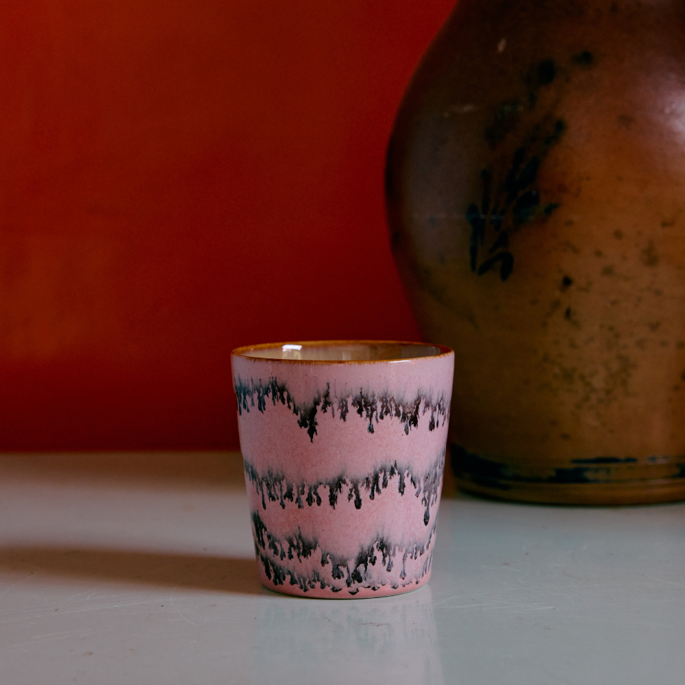 Retro yet modern: the coolest coffee mugs. De Coffee Mugs van HKLIVING hebben een subtiele meer rechte vorm. De kleur Bubble is een suikerspin-roze tint met donkere drips. De 70s ceramics van HKLIVING worden handbeschilderd en geglazuurd, elk item is dus uniek.