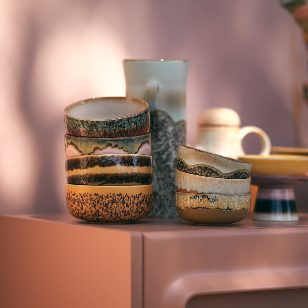 Bring some seventies flair to the table. De Dessert Bowl in de kleur Bay van HKLIVING brengt direct kleur en sfeer op tafel. Deze prachtige, unieke schaaltjes kun je ook perfect matchen met de andere styles uit de 70s ceramics collectie. Een ideaal formaat voor tapas of toetjes! De 70s ceramics van HKLIVING worden handbeschilderd en geglazuurd, elk item is dus uniek.