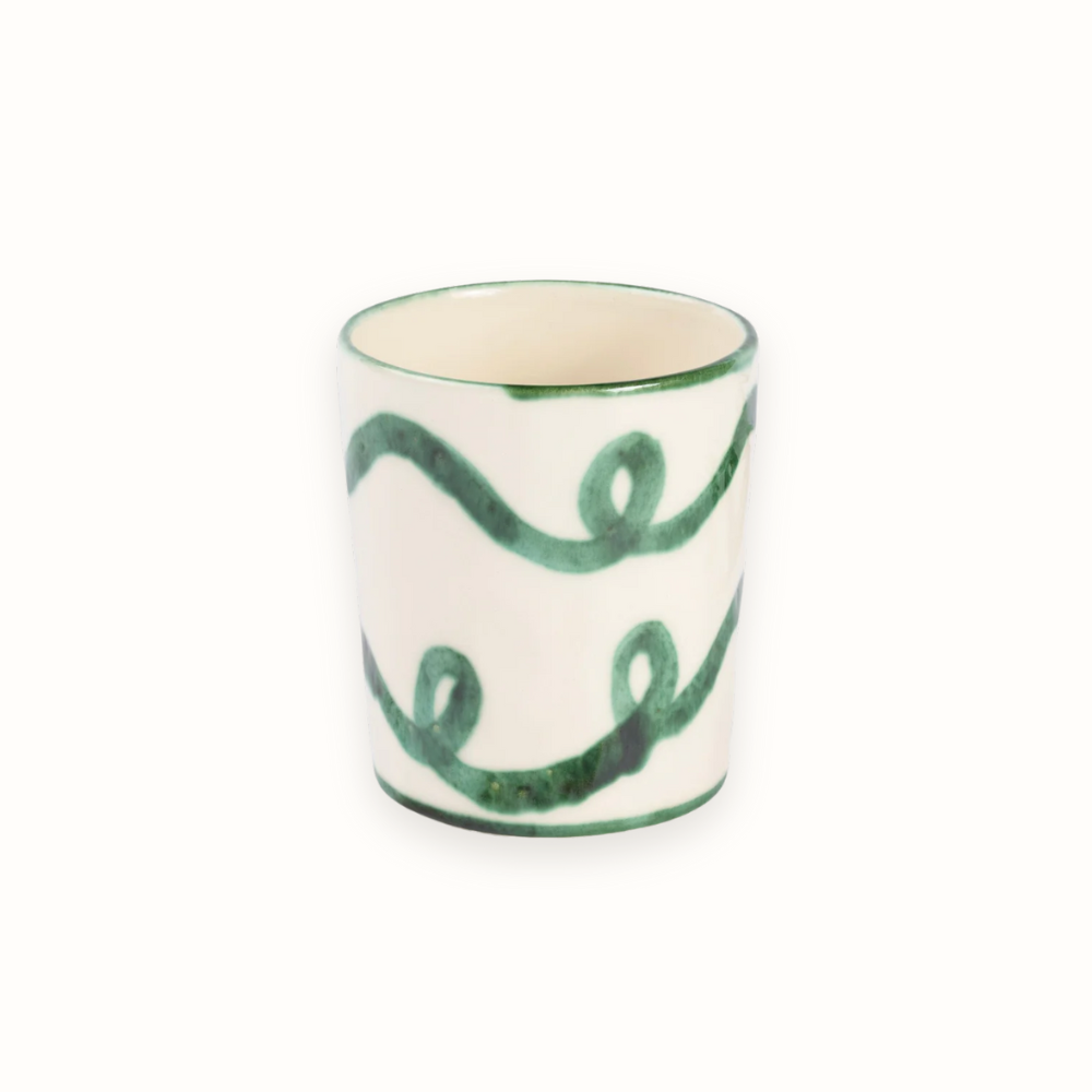 Het perfecte formaat voor eenafternoon pick-me-up. De Olaf Latte Cup van Denise geeft een instant sfeervol gevoel door de prachtige diepgroene handbeschilderde krullen. Precies goed wanneer je een beetje TLC (tender latte care) nodig hebt. Handgemaakt en beschilderd in Portugal.