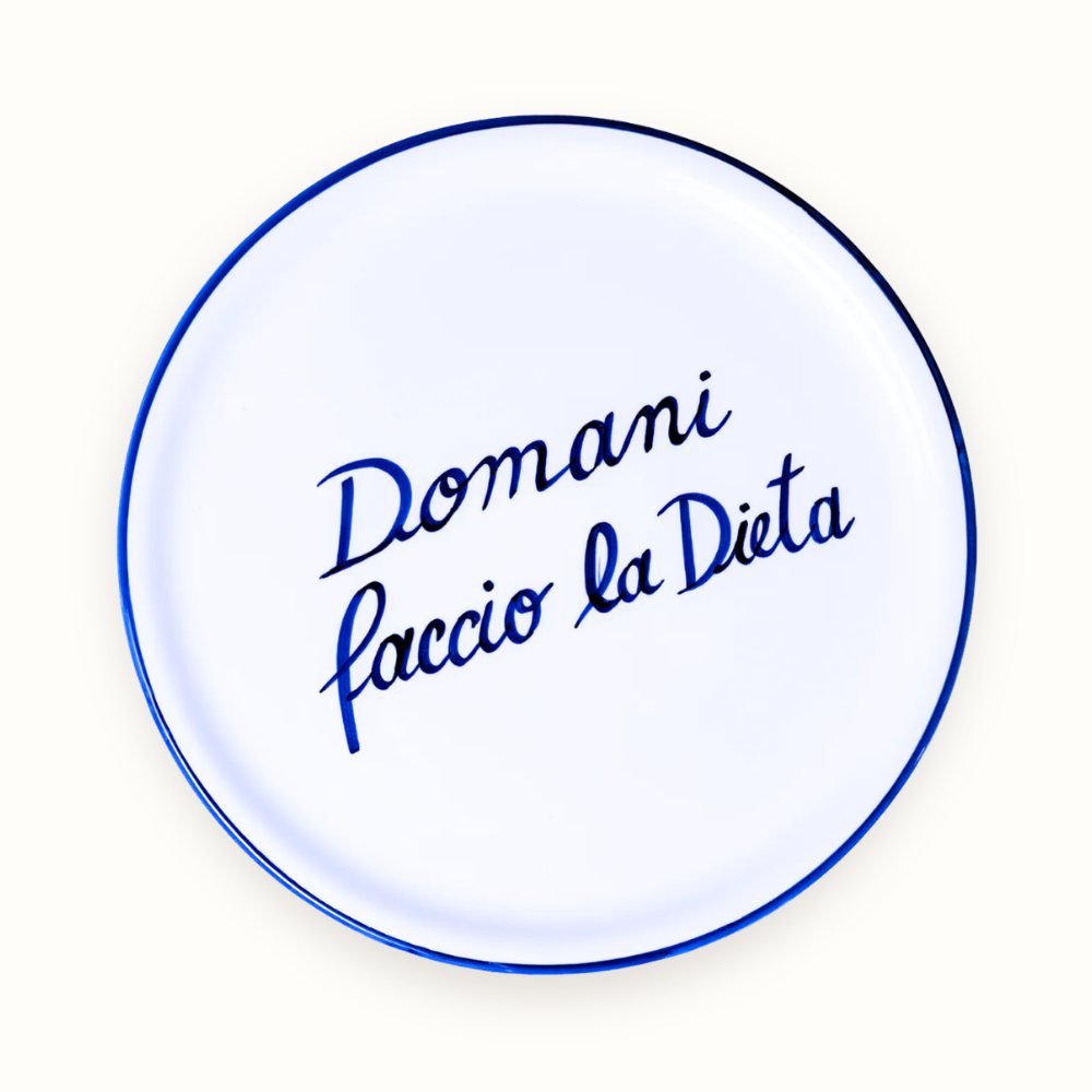 Domani faccio la dieta (Morgen begin ik met een dieet). Van een heerlijke quattro formaggi tot aan een klassieke pepperoni, met de La Dieta Pizza Plate serveer je jouw favoriete pizza in stijl én met een knipoog. Elk stuk servies uit Italië is met de hand beschilderd, uniek in kleur en detail. Afkomstig uit verschillende regio's met ieder zijn eigen traditionele schilder-kenmerken. Een bijzonder detail dat elk diner nét dat beetje extra geeft.